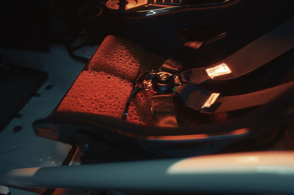 La carrozzeria è dipinta di argento opaco con rivestimento gradiente in Highspeed Orange e Curbisde Red metallizzato che parte da circa metà vettura e va poi a coprire il posteriore. Gli interni sono essenziali, praticamente non c’è nulla tranne i sedili e il display con le informazioni di sicurezza e/o necessarie per lo svolgimento dell’attività di pace car. Quasi tutto è coperto da fibra di carbonio a vista, inclusi freno a meno, leva del cambio e controlli per le luci di segnalazione.