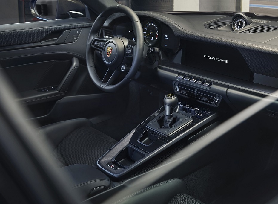 Anche gli interni sono stati modificati e rieditati, con ampio uso di pelle per darle un aspetto meno corsaiolo e più da granturismo. Corona del volante, leva del cambio, braccioli, pannelli, e console centrale sono interamente rivestiti di questo materiale (con cuciture nere), mentre i sedili sono in misto pelle-tessuto sportivo, anch’essi in nero, con stemma Porsche in rilievo sul poggiatesta. Anche i battitacco e profili di cruscotto e console centrale hanno lo stesso tema cromatico, con alluminio nero spazzolato.