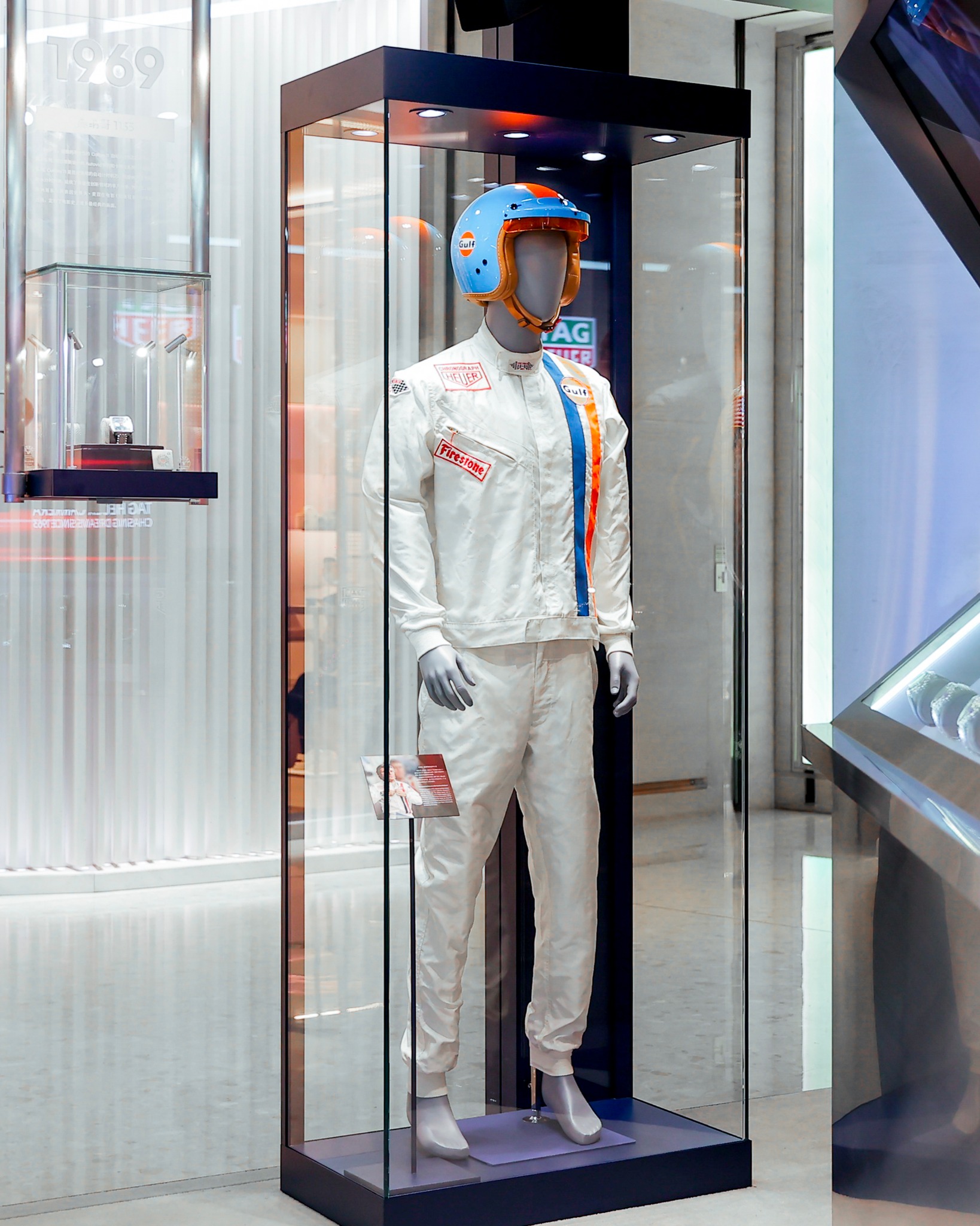 Oltre all’iconico TAG Heuer Monaco, il negozio si presenta anche dei modellini in scala del box Red Bull, oltre a una tuta con l’iconica livrea marchiata Gulf, utilizzata spesso in passato da piloti ‘sponsorizzati’ TAG Heuer.