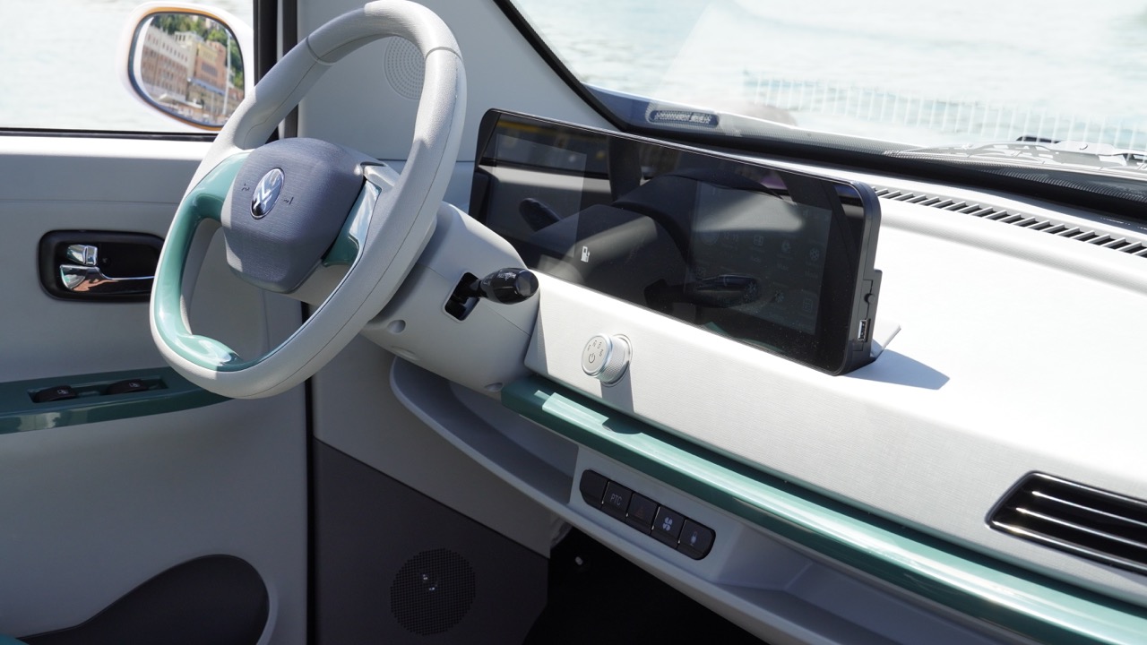L’auto è semplice, e l’allestimento scarno. La versione base ha due schermi digitali, uno per il cruscotto e l’altro al centro della plancia, e retrocamera per i parcheggi oltre a due prese USB.