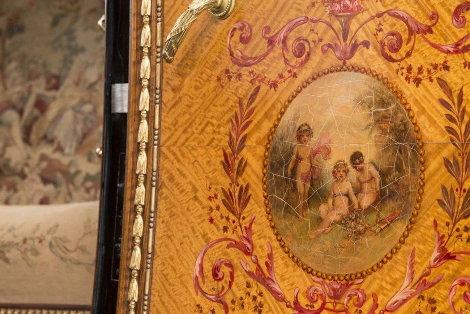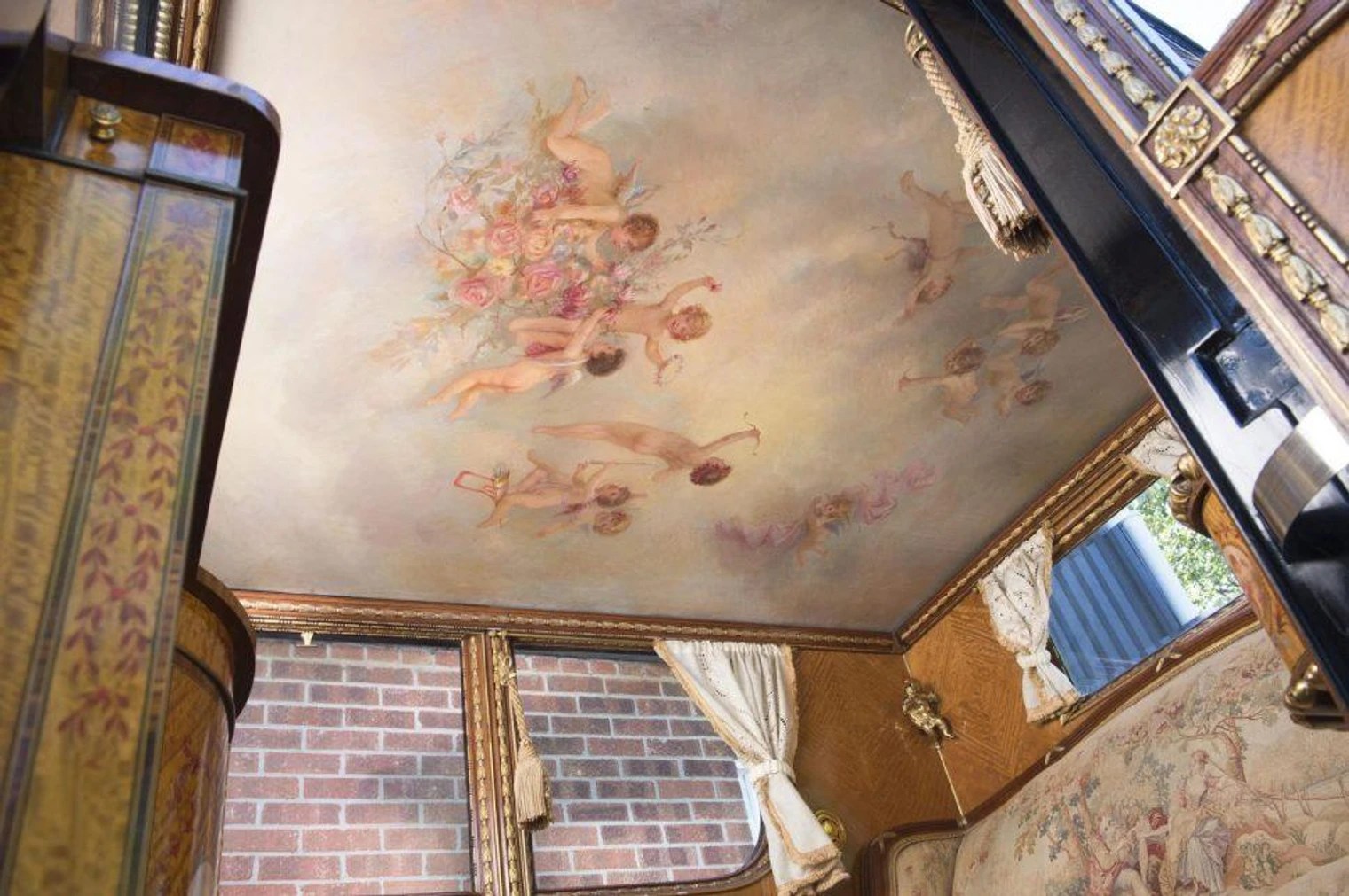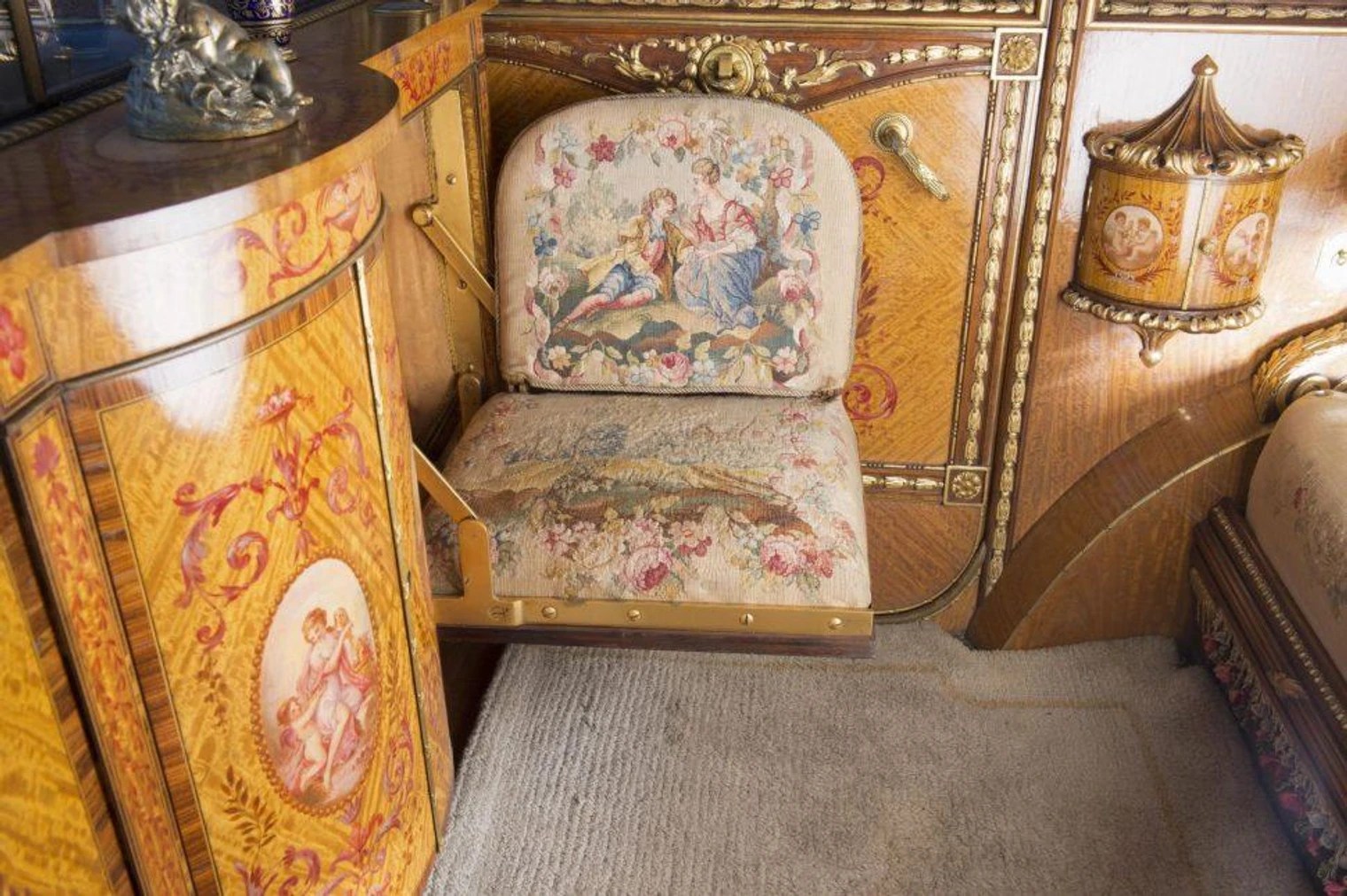 Gli interni vennero realizzati seguendo lo stile del palazzo in cui vivevano Luigi XVI e Maria Antonietta di Francia, con divanetto decorato, inserti in legni e oro, tendine e soffitto dipinto.