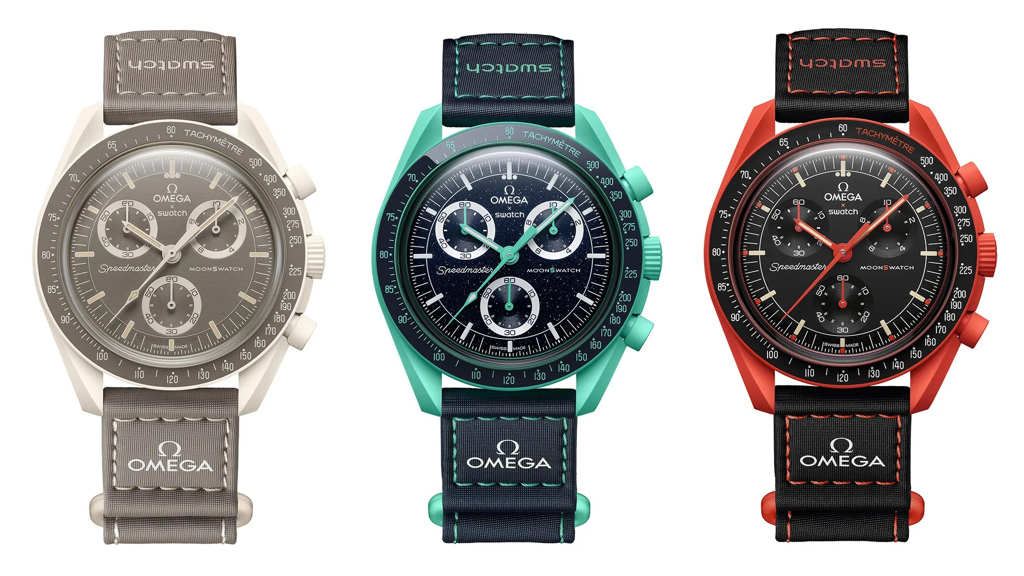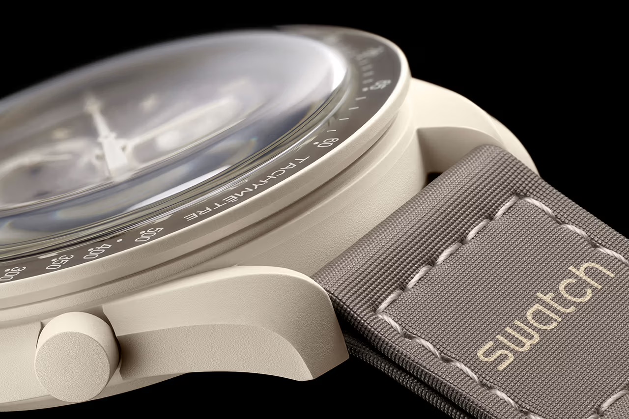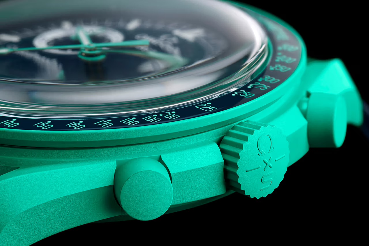 Come sempre, l’orologio è sviluppato su base Swatch, costruito in ‘Bioceramic’ che, spiace dirlo, è semplicemente un modo un po’ più edulcorato per riferirsi alla plastica riciclata.