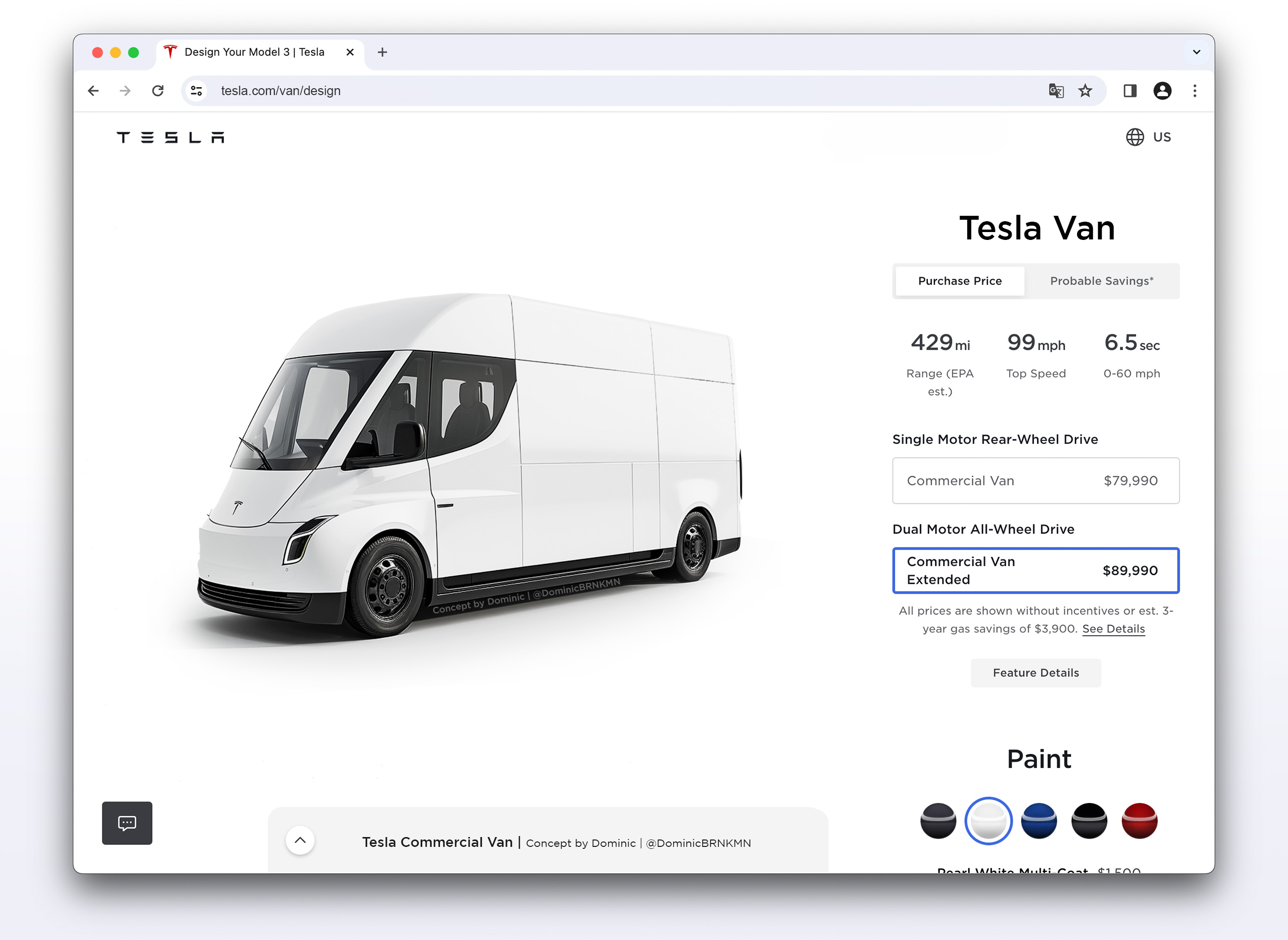 Come spesso accade, qualcuno si è già affrettato a creare dei concept, tra l’altro molto realistici, sia per quelli che potrebbero essere dei potenziali disegni che anticipano il veicolo di produzione, sia per quanto riguarda invece la pagina del sito Tesla dove trovare il furgone, semplicemente chiamato ‘Tesla Van’.