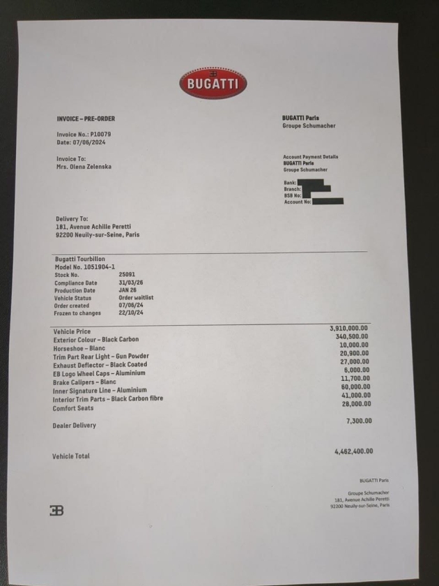 A parte il fatto che Bugatti non si sognerebbe mai di pubblicare una fattura di un cliente, con tanto di dati anagrafici in bella vista, online, e già questo dovrebbe bastare a far capire che si tratta di un falso.