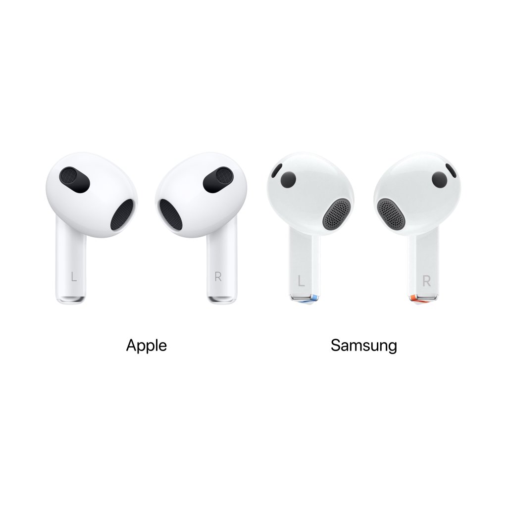 Le cuffie, Buds Pro, sono praticamente identiche a parte la ‘base’ della cuffia che si aggancia al punto di ricarica, che nelle cuffie Samsung è leggermente più squadrato rispetto a Apple AirPods.
