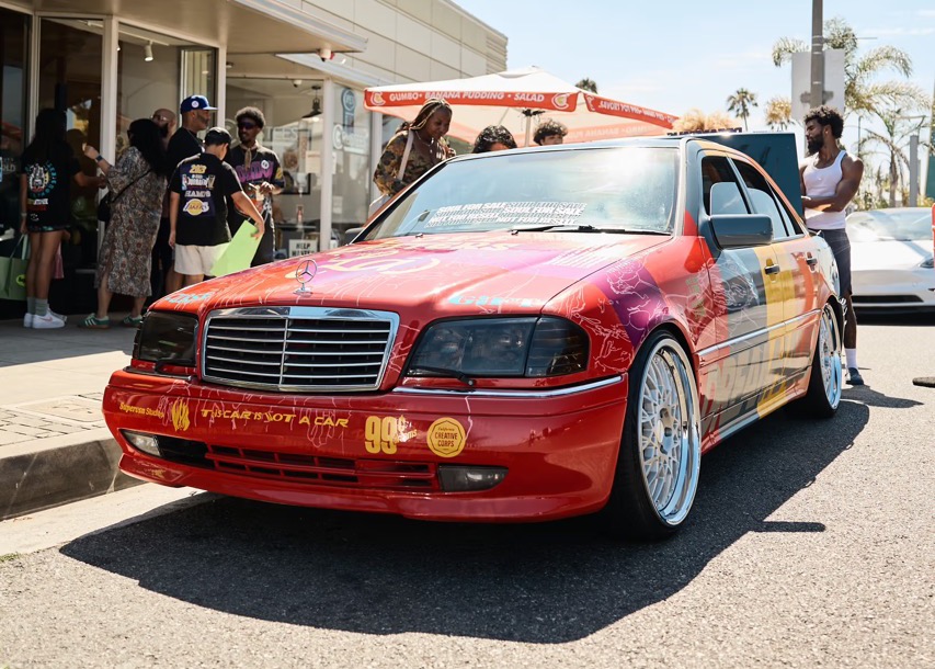 La Mercedes è stata trasformata sia negli interni che nella carrozzeria, che è stata stata ricoperta da un tripudio di colori brillanti e slogan, tra cui risaltano ‘Love letters for LA’ sul cofano e ‘Soul for Sale’ sul parabrezza.