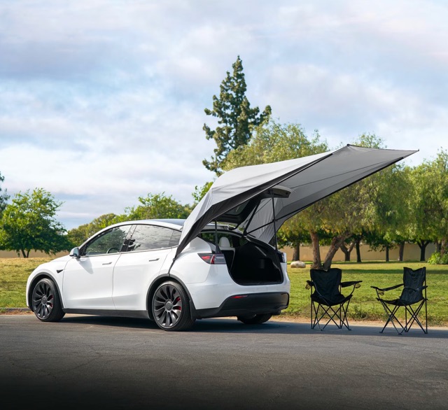 L’ultimo prodotto aggiunto, dopo le varie tende per Cybertruck e persino il materasso per il baule di Model Y, è una tenda pensata per essere agganciata a Model Y.