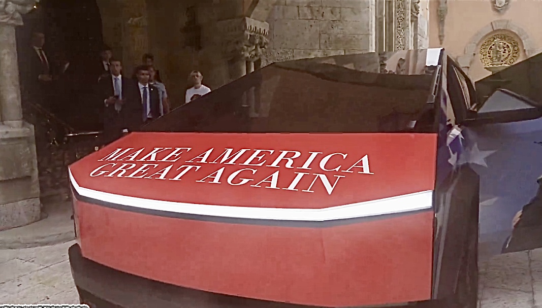 La parte più comica, ennesima conferma di come il mondo in cui viviamo sia davvero surreale, è che il Cybertruck è decorato con l’iconica foto di Trump con il pugno alzato appena dopo l’attentato.
