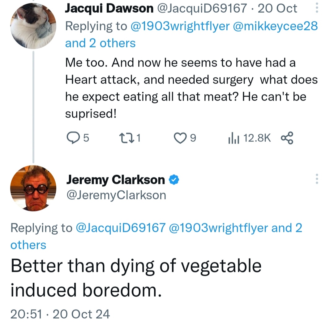 Una risposta a "Troll vegano attacca Jeremy Clarkson e lui ironizza, “meglio che morire di noia”"