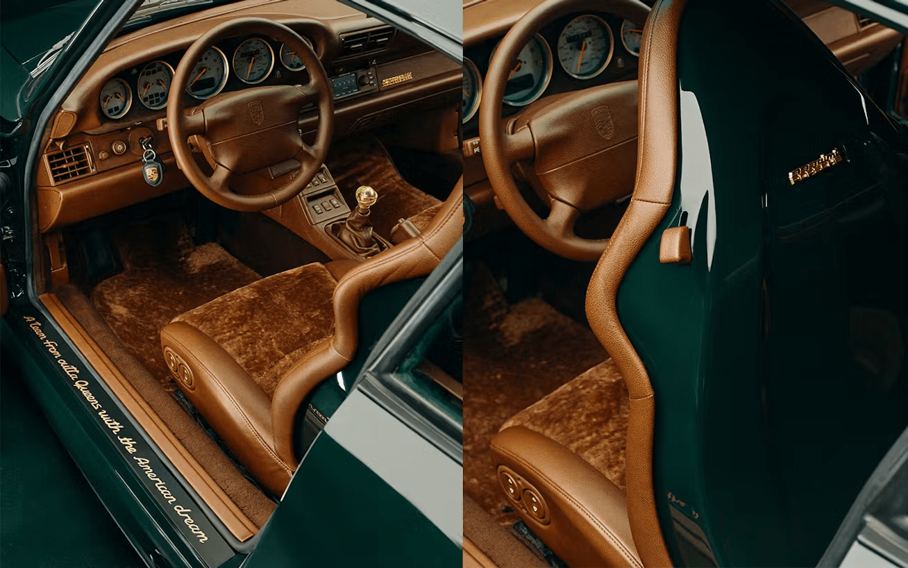 Tuttavia, almeno qui, l’auto si vede e il target della clientela Porsche è azzeccato, senza menzionare il magnifico lavoro di restauro sulla 993 Turbo degli anni novanta, che sfoggia interni lussuosi in pelle e lana, nei toni del marrone e Mulberry Green, tonalità sviluppata da ALD e sorta di marchio di fabbrica della casa, che è stata scelta anche per la carrozzeria abbinandola a rifiniture in oro.