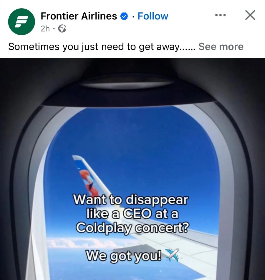 Poi abbiamo Frontier Airlines, compagnia aerea semi-low cost in USA, che ha pubblicato un’immagine con scritto, “vuoi sparire come un CEO al concerto dei Coldplay? Ci pensiamo noi.”
