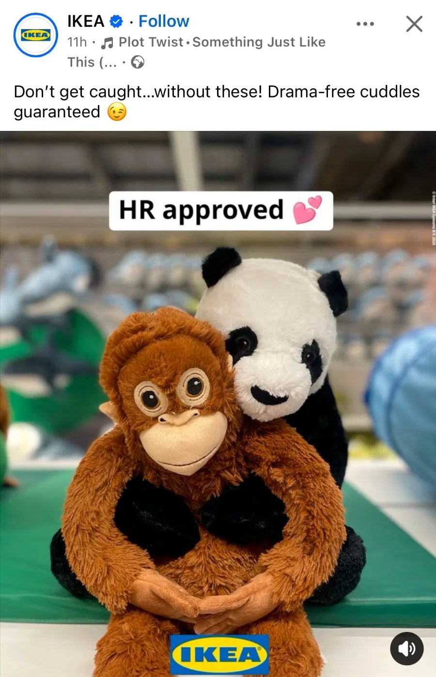 Tra i primi a scatenarsi abbiamo Ikea, che ha pubblicato una foto con due peluche che si abbracciano e la didascalia, “approvato da HR”.