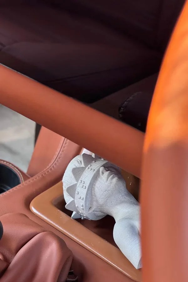 Si fanno notare anche varie scritte, con cucitura a mano, sui poggiatesta e sul cruscotto lato passeggero, ‘Moment of Clarity’.