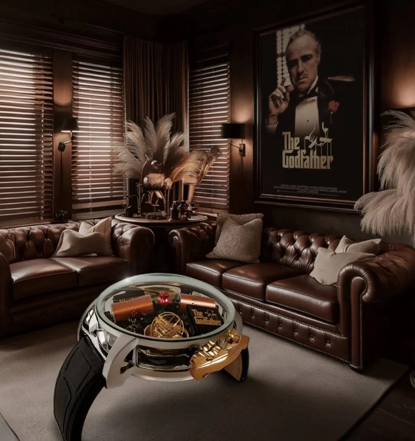Esattamente come l’orologio da polso da cui prende ispirazione, il tavolino contiene al proprio interno diversi elementi che rendono omaggio al film The Godfather (Il padrino, in Italia), con un’attenzione ai dettagli davvero notevole.