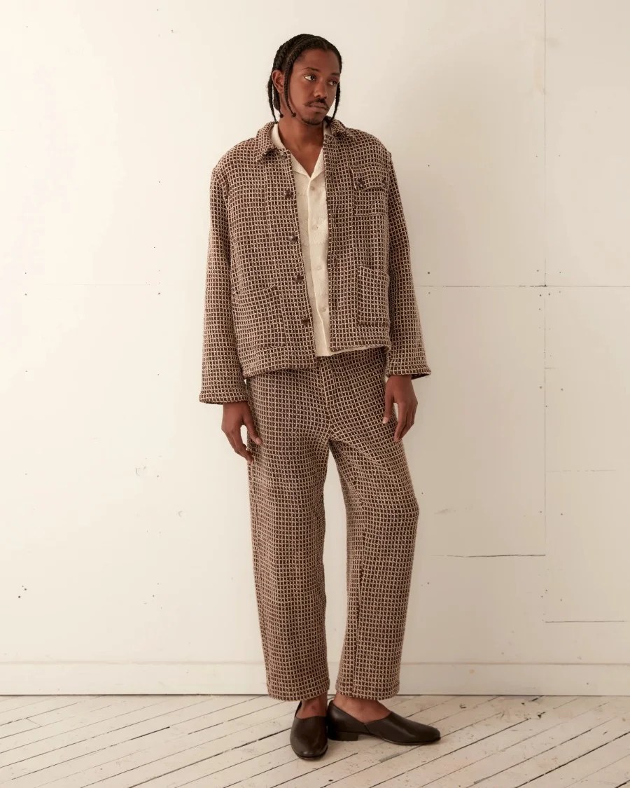 BODE, un brand di lusso (si definiscono così) statunitense, ha creato un intero completo – giacca più pantaloni – con tessuto che riprende un po’ il ‘design’ di un waffle (foto sotto).