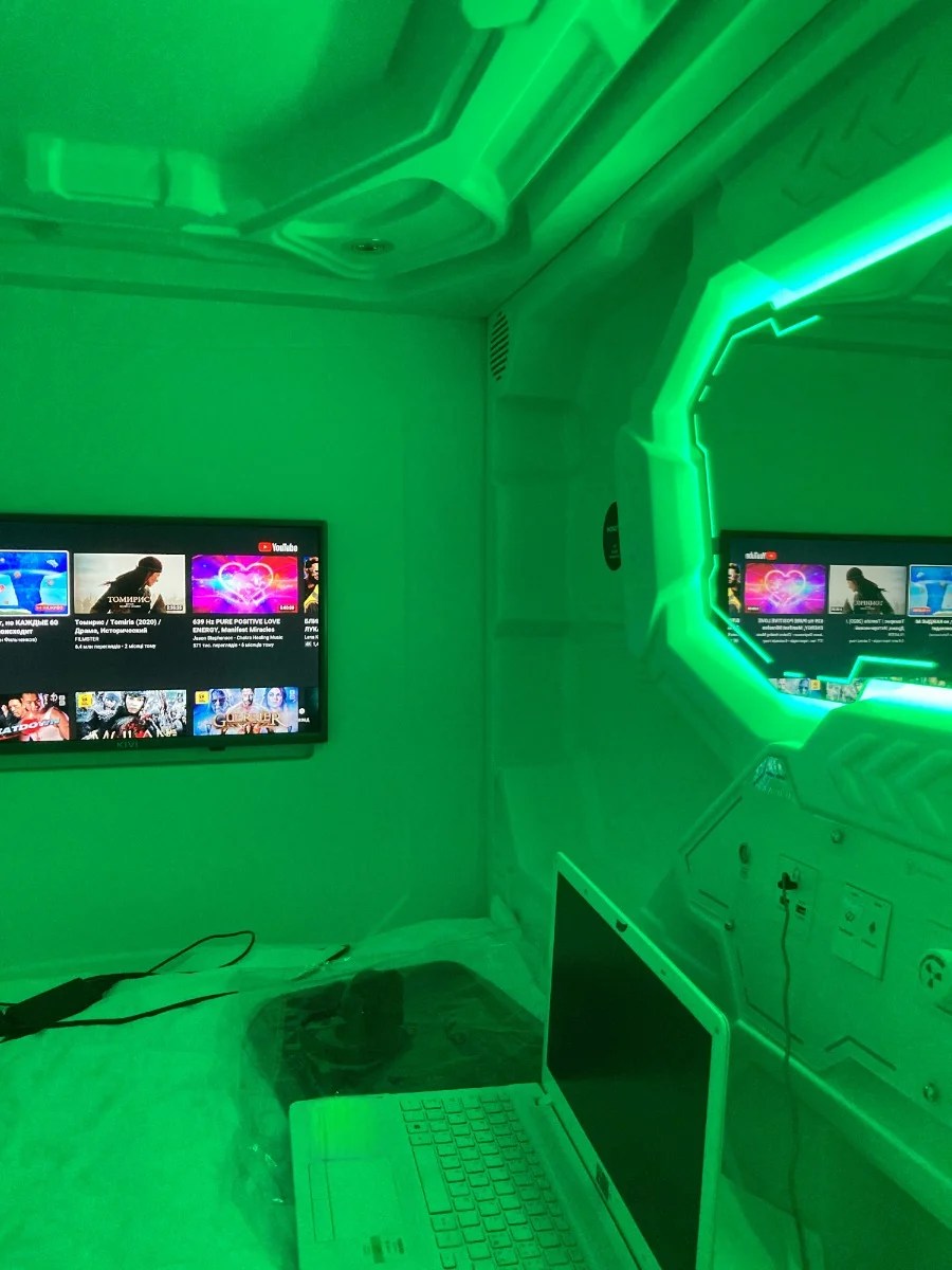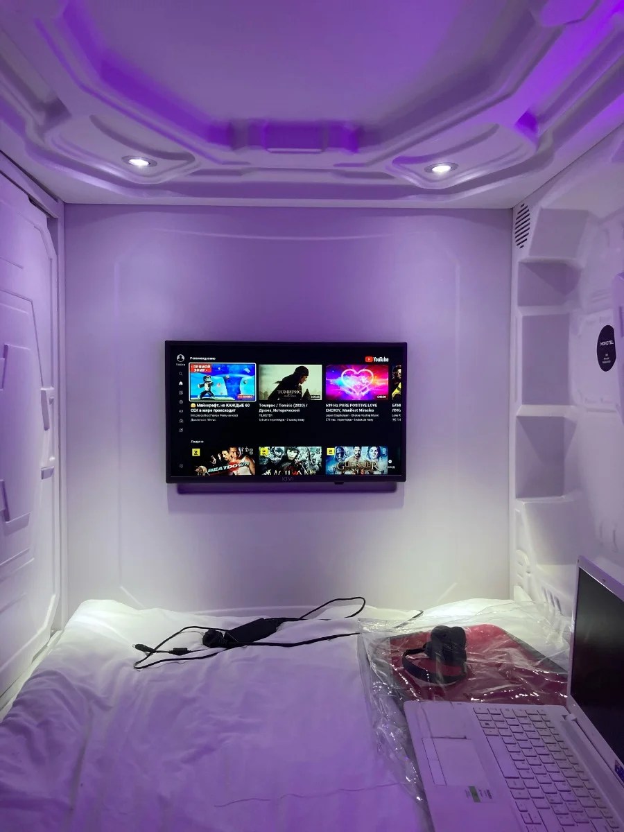 All’interno della capsule si hanno delle tasche per riporre oggetti, prese per caricare telefoni, portatili e così via, una televisione (connessa a internet) e uno specchio.