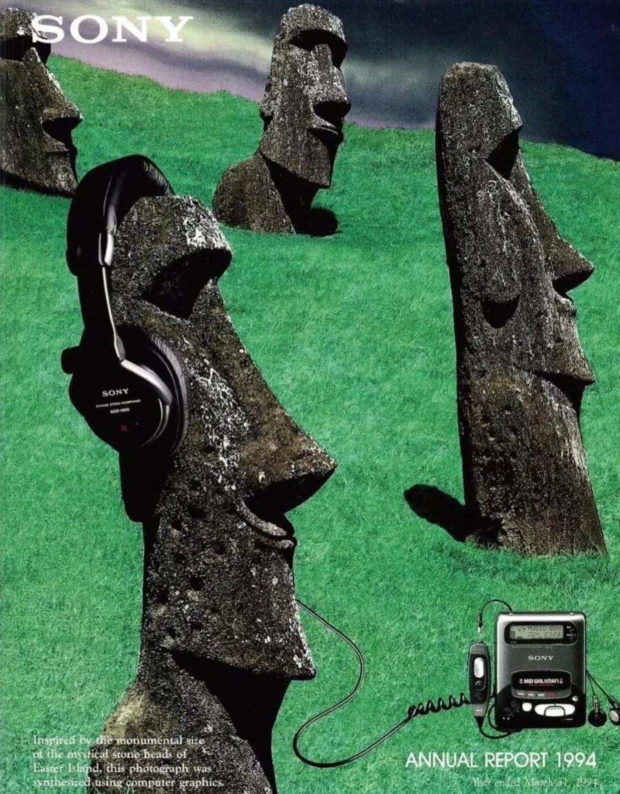 Chi ricorda i moai – i famosi ‘testoni’ dell’Isola di Pasqua che indossano (si fa per dire) cuffie Sony per ascoltare il mitologico Walkman.