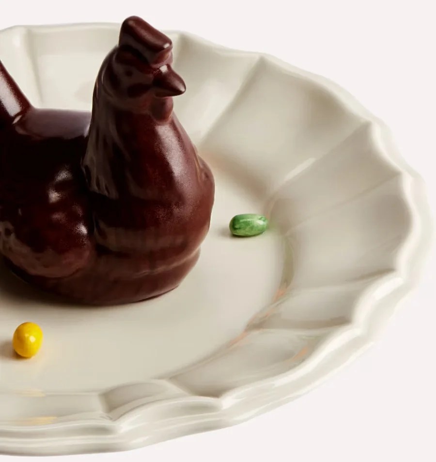 Rifinito in cioccolato fondente con dettagli in cioccolato bianco, l’uovo nascoste anche dettagli all’interno, inclusi piccoli cioccolatini decorativi, oltre a una gallina ‘complementare’ in cioccolato al latte.