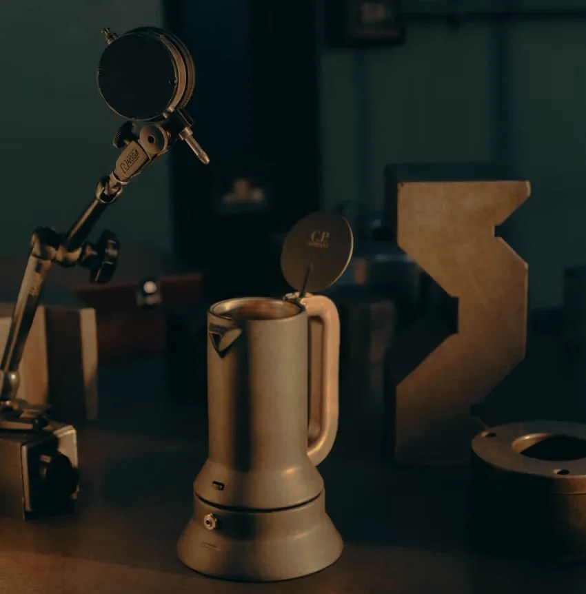 S’inizia dalla caffettiera 9090 di Richard Sapper, reinterpretata con una finitura in PVD nero opaco, stessa tecnica usata nella tintura in capo di C.P. Company, permette all’oggetto di invecchiare con l’uso, sviluppando una patina unica.